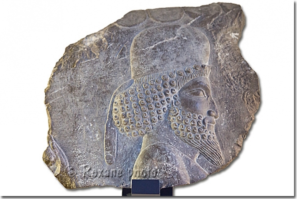 Ce bas-relief en calcaire représente la tête d'un porteur d'offrandes Mède. Il a été retrouvé à Persépolis en Iran et date de la période achéménide (5e siècle avant JC).